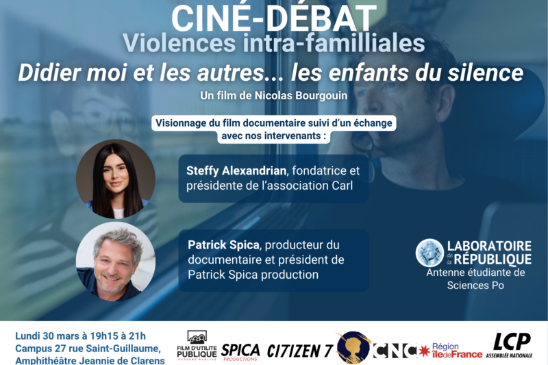 Le Laboratoire de la République, antenne de Sciences Po Paris, organise un ciné-débat consacré aux violences intra-familiales. À travers la projection du documentaire « Didier, moi et les autres… les enfants du silence » et un échange avec des intervenants engagés, cet événement entend ouvrir un espace de discussion sur une réalité encore trop souvent tue.
