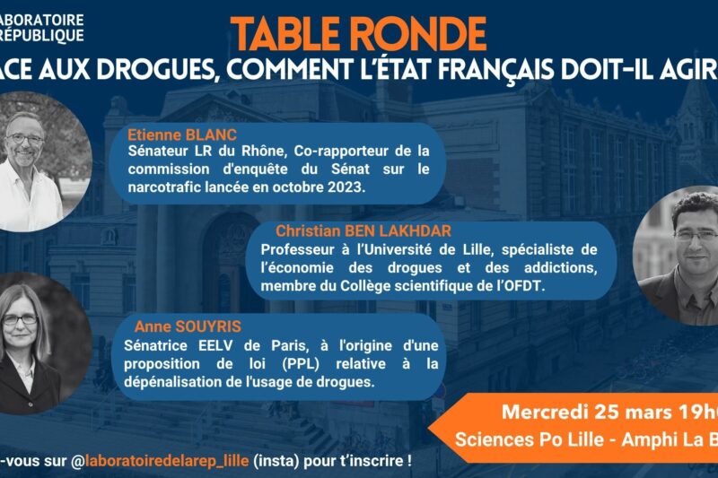 Elle réunira Étienne Blanc, co-rapporteur de la commission d’enquête du Sénat sur le narcotrafic, Christian Ben Lakhdar, professeur d’économie à l’Université de Lille et spécialiste des conduites addictives, ainsi que Anne Souyris, à l’origine d’une proposition de loi relative à la dépénalisation de l’usage de drogues.