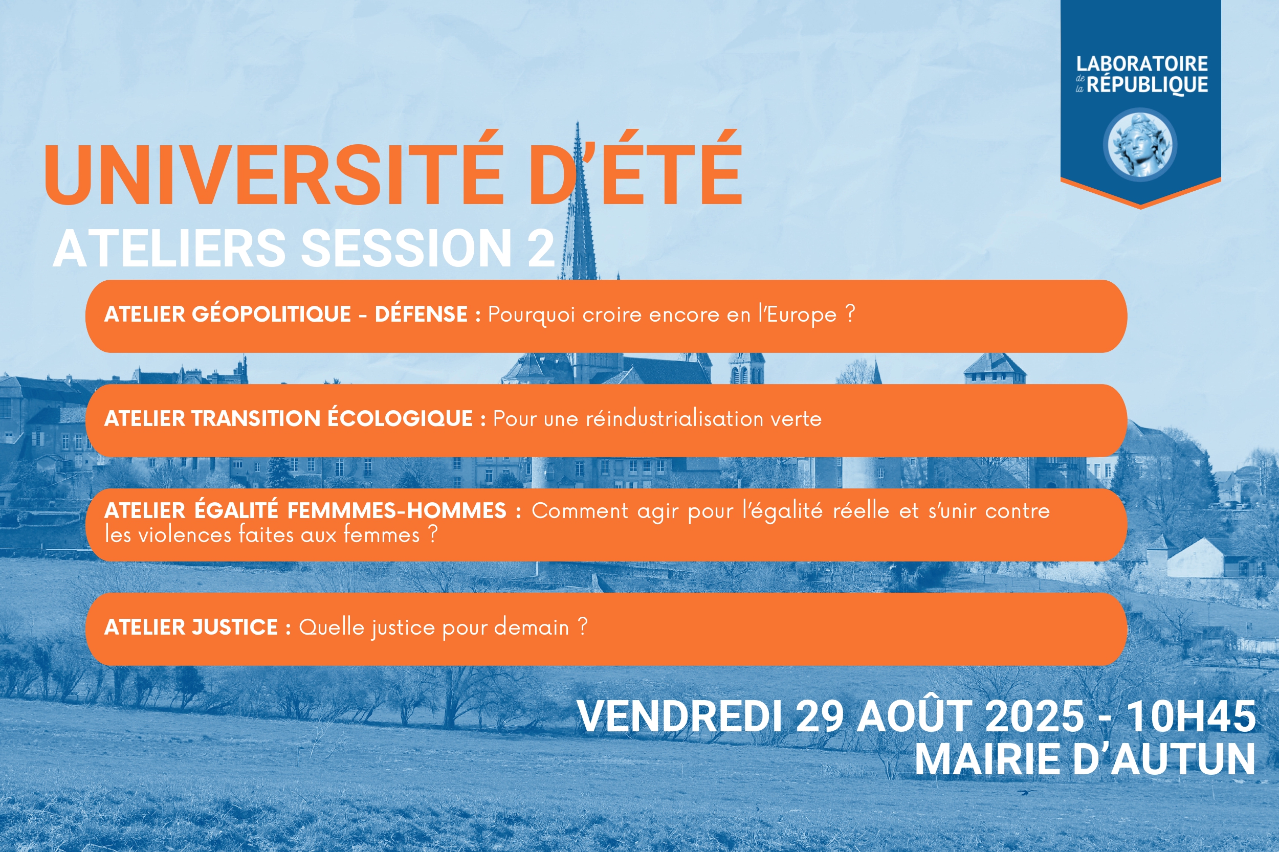 Cette seconde session d’ateliers, vendredi 29 août de 10h45 à 12h15 en mairie d’Autun, réunira des personnalités engagées autour de quatre thèmes structurants du projet républicain.