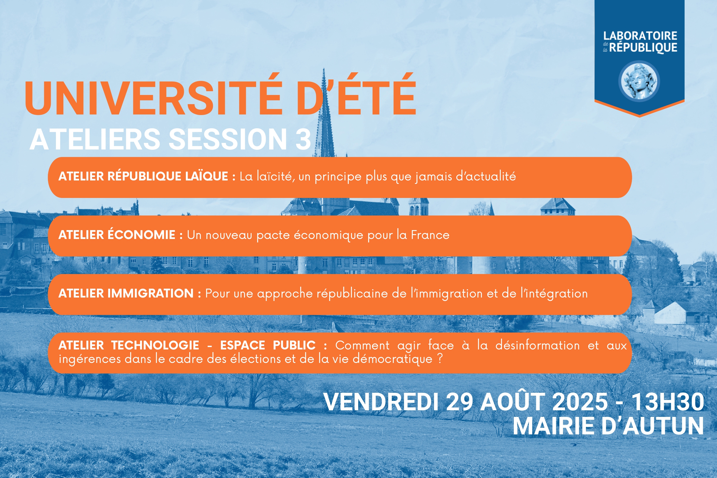 Cette ultime session d’ateliers, vendredi 29 août de 13h30 à 15h00 en mairie d’Autun, réunira des personnalités engagées autour de quatre thèmes structurants du projet républicain.